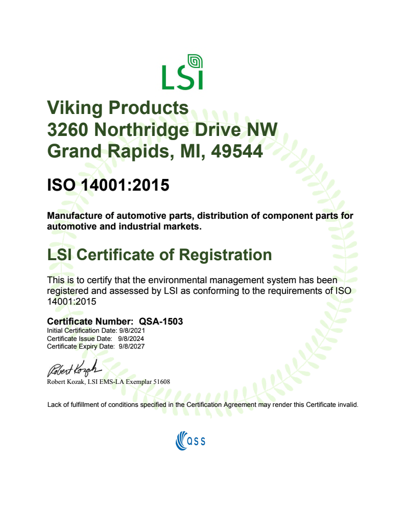 At Viking Products we are committed to delivering quality products. We are certified to IATF 16949, ISO 9001:2015, and ISO 14001:2015. Our philosophy is one of continuous improvement; this philosophy has created a company culture centered on learning and applying the latest technologies to meet and exceed our customer’s needs.